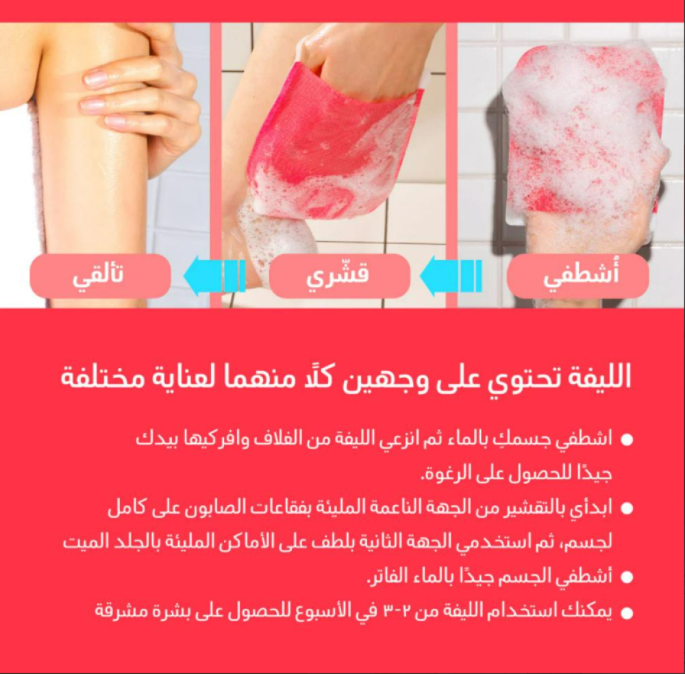 الفوائد: إزالة خلايا الجلد الميتة بلطف – ترطيب البشرة – منحها شعور بالانتعاش والنضارة بعد الاستحمام.