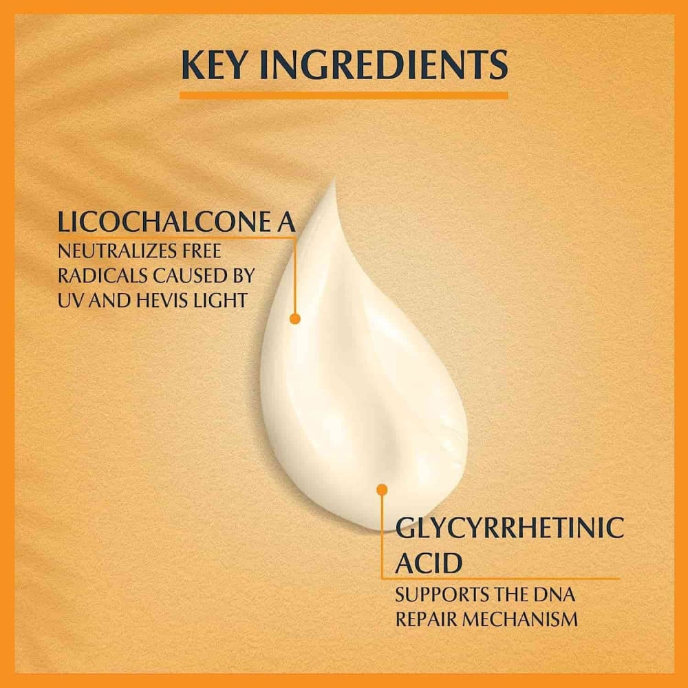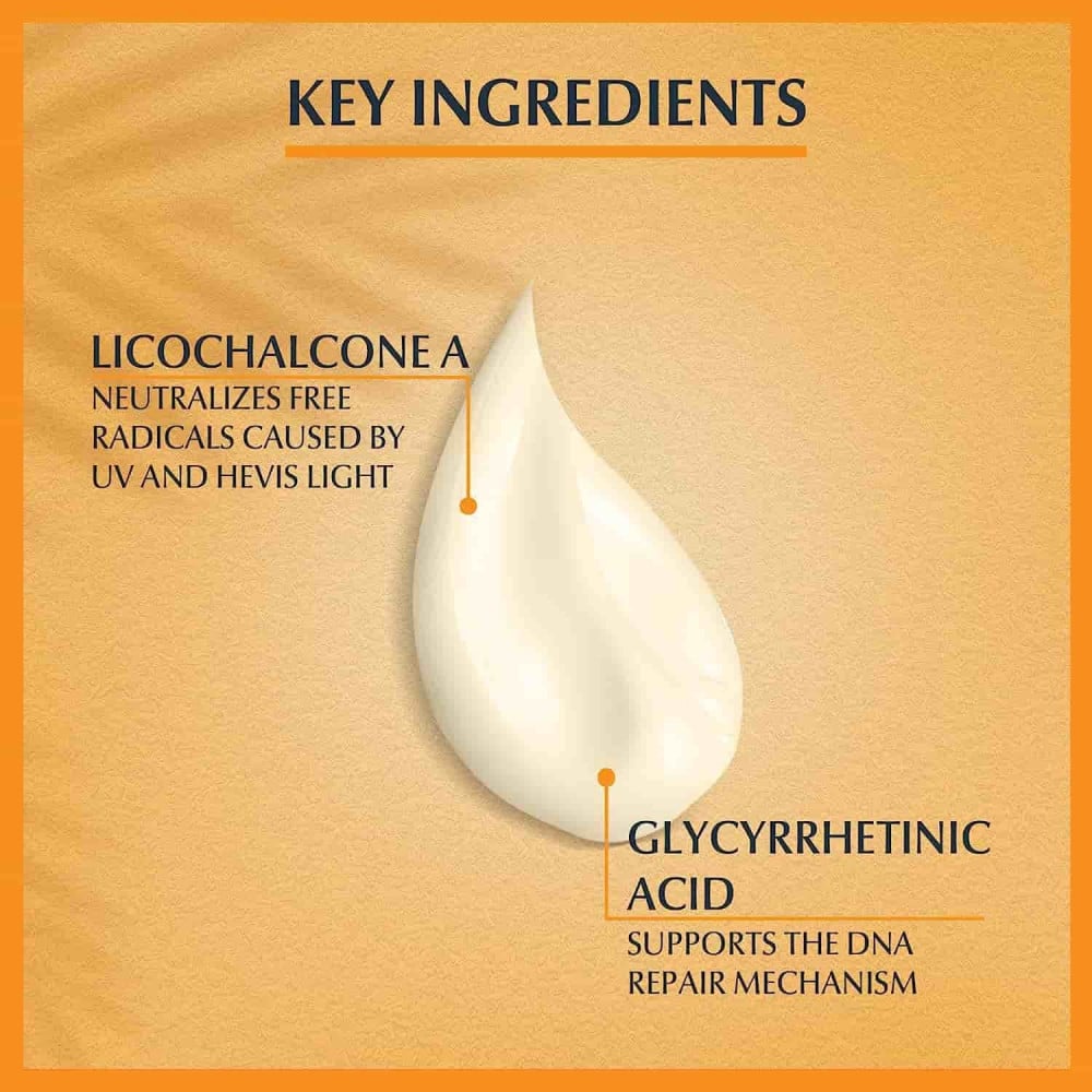 تعمل على تحييد الجذور الحرة الناتجة عن ضوء الأشعة فوق البنفسجية ،بينما يدعم Glycyrrhetinic Acid آلية إصلاح الحمض النووي لبشرتك.